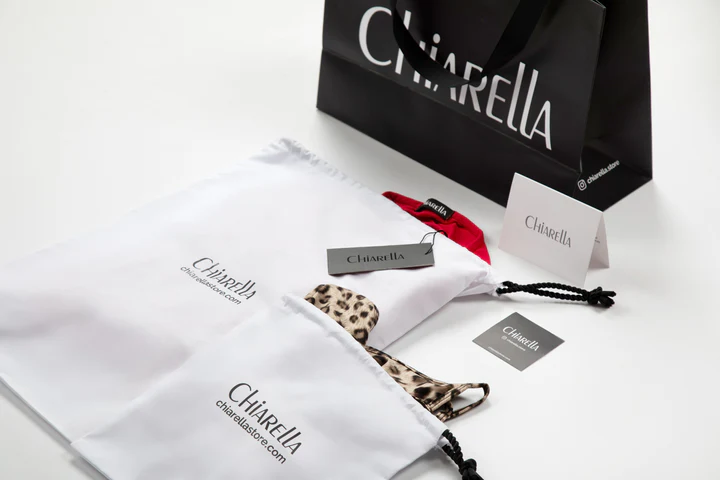 Cada prenda Chiarella llega en un packaging pensado para sorprender: bolsas de tela, neceseres, cajas de terciopelo, y pequeños regalos que hacen de cada pedido una experiencia única.