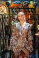 Mono corto con estampado animal en tonos tierra, escote cruzado con cierre lateral, volantes decorativos y short interior.