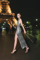 Vestido largo, ceñido, con un diseño de lentejuelas que forman un estampado de leopardo. El escote es profundo en V y de estilo halter, lo que aporta un toque seductor. Además, todo el vestido lleva un fino forro de tul elástico con estampado animal print. La espalda queda completamente descubierta y tiene una abertura lateral en la falda, que añade movimiento y un toque elegante.