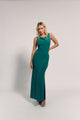 Perfecto para eventos formales o de gala, este vestido combina simplicidad y detalles llamativos para un look sofisticado.