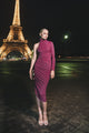 Vestido a media rodilla de corte asimétrico y estilo ajustado al cuerpo, destacando por un diseño de un solo hombro. La parte superior presenta una manga larga en el lado izquierdo y un cuello alto, mientras que el lado derecho deja el hombro descubierto con un elegante escote en la espalda. El tejido tiene un brillo sutil. Además, el fruncido en los laterales del vestido acentúa la silueta de manera favorecedora, realzando la figura femenina.