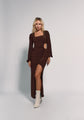 Vestido largo con un diseño ajustado y detalles que lo hacen elegante y moderno. Tiene un corte asimétrico en la parte inferior, con una abertura lateral que expone la pierna de manera llamativa. En la zona de la cintura, cuenta con un detalle de fruncido que crea un efecto visual interesante, además de un recorte en uno de los costados que añade un toque atrevido. Las mangas son largas y ligeramente abullonadas, con puños ajustados. El cuello es de escote cuadrado.
