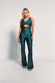 Le gambe sono dritte e lunghe, strette sui fianchi e più larghe verso le caviglie, donando una silhouette stilizzata e allungata. Questa tuta mette in risalto la silhouette in modo moderno e audace.