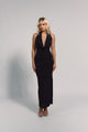 Abito lungo con collo drappeggiato, spalline all'americana, aderente al corpo, che accentua la silhouette. La parte posteriore dell'abito è scoperta, trattenuta solo da una sottile spallina. Inoltre, presenta uno spacco laterale sulla gonna, che aggiunge un tocco di sensualità ed eleganza.