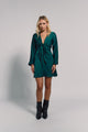 Abito corto realizzato in tessuto satinato che gli conferisce una finitura lucida. Sul davanti ha un fiocco che si annoda appena sotto il busto, creando una profonda scollatura a V. Ha una doppia fodera sul petto, e le maniche sono lunghe e a sbuffo con estremità strette ai polsini.