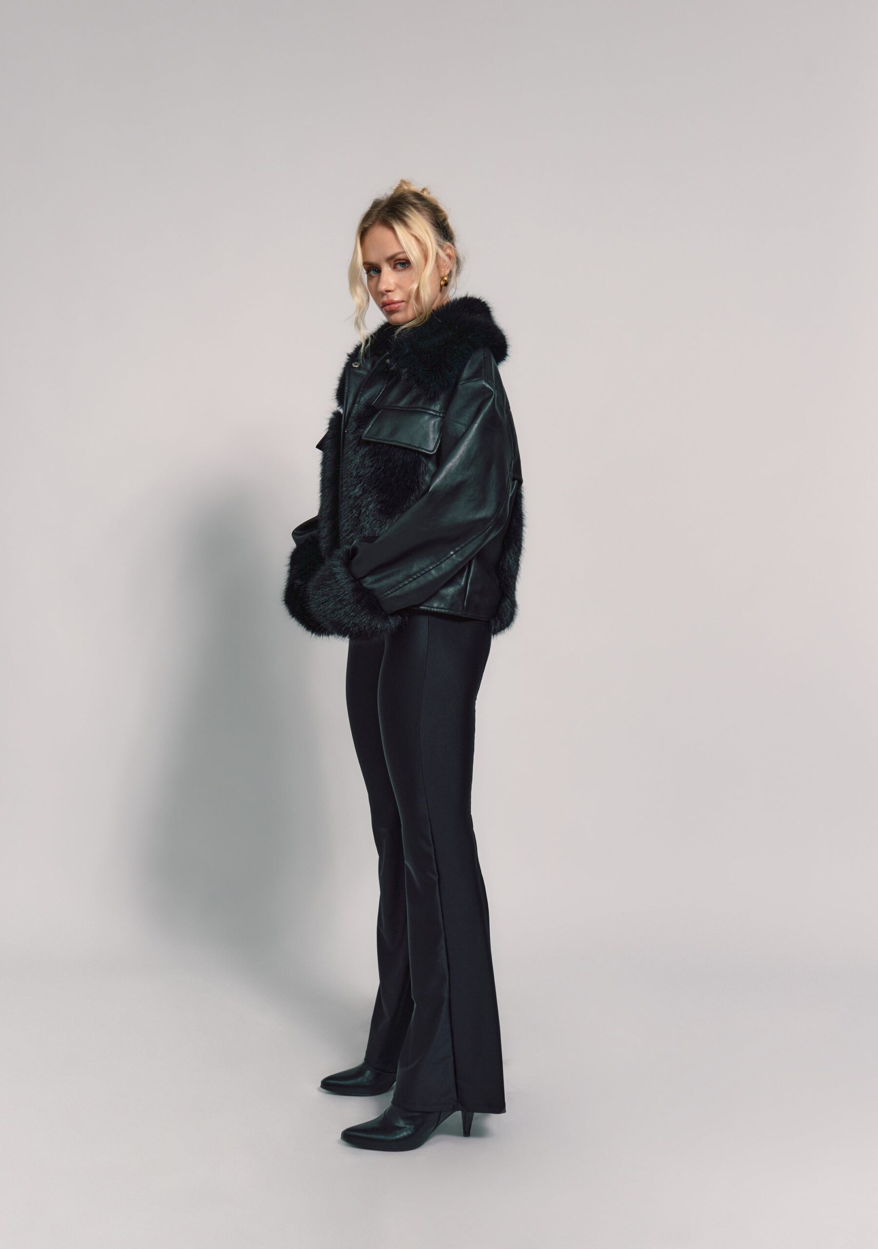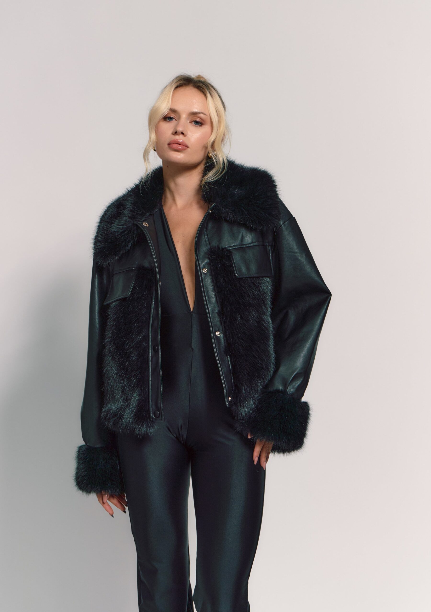 Abrigo con un diseño elegante y una combinación de texturas. Está confeccionado en cuero con detalles de piel sintética en el cuello, puños y parte frontal. La piel añade un toque de lujo y sofisticación, mientras que el cuero le da un aire moderno y urbano. El corte es ligeramente holgado, proporcionando comodidad y estilo al mismo tiempo. Además, el color negro profundo le otorga un look versátil que puede combinarse fácilmente con diferentes prendas.