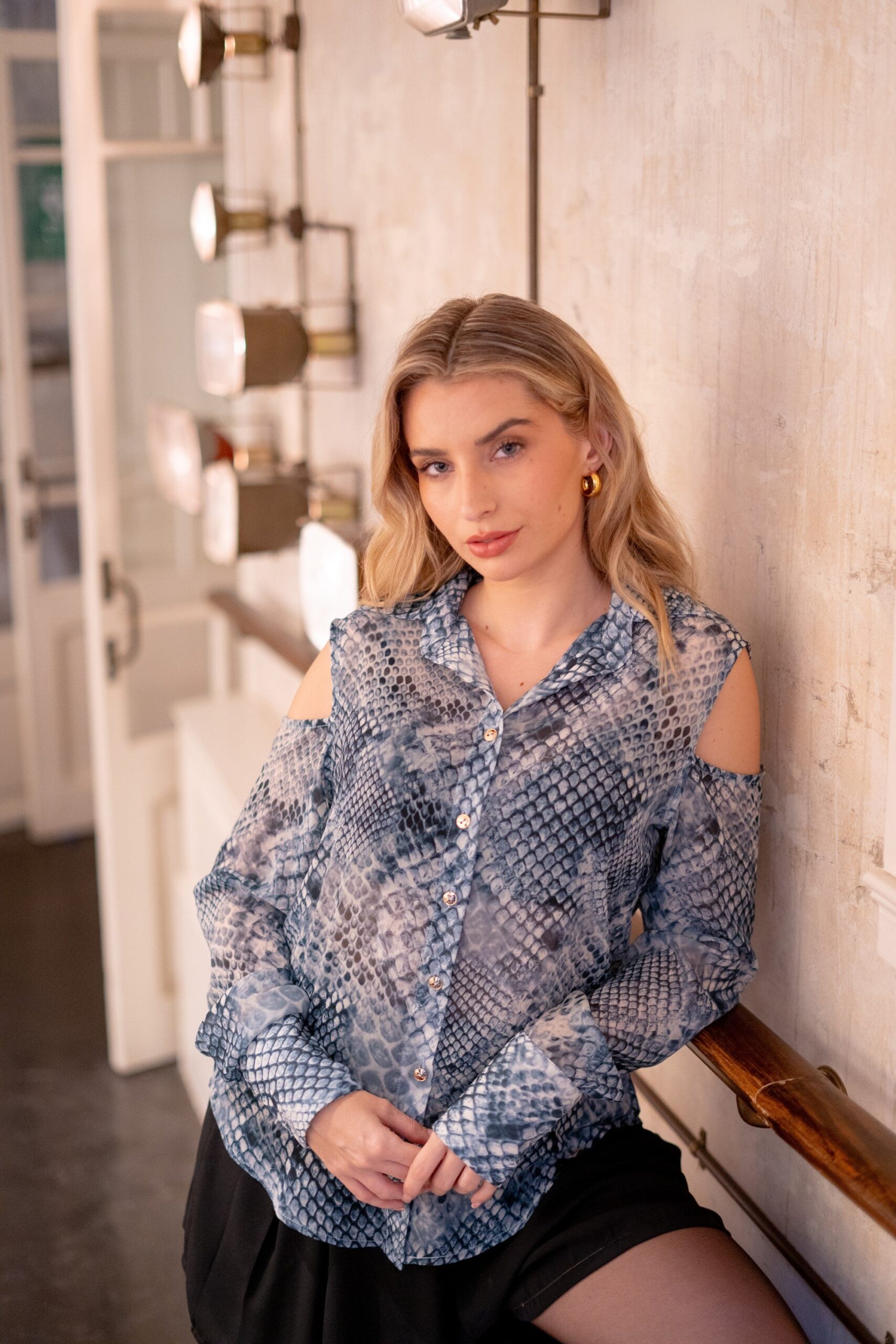 Blusa de gasa con estampado serpiente en tonos azulados. Cuello camisero, hombros descubiertos y botones dorados.
