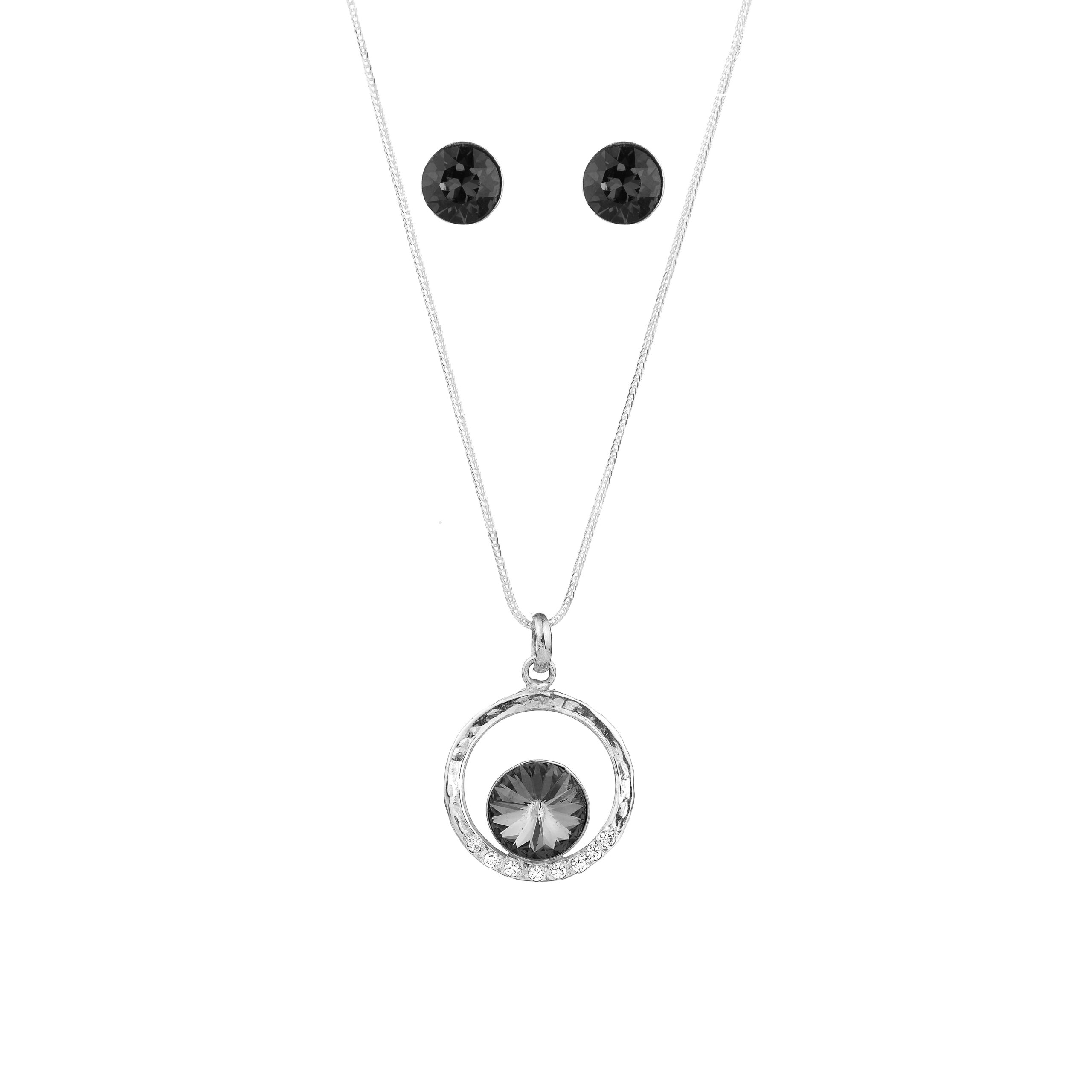 Collar y pendientes a juego fabricado en plata de ley 950 con dije colgante en forma de circulo con circón redondo central y minicircones.