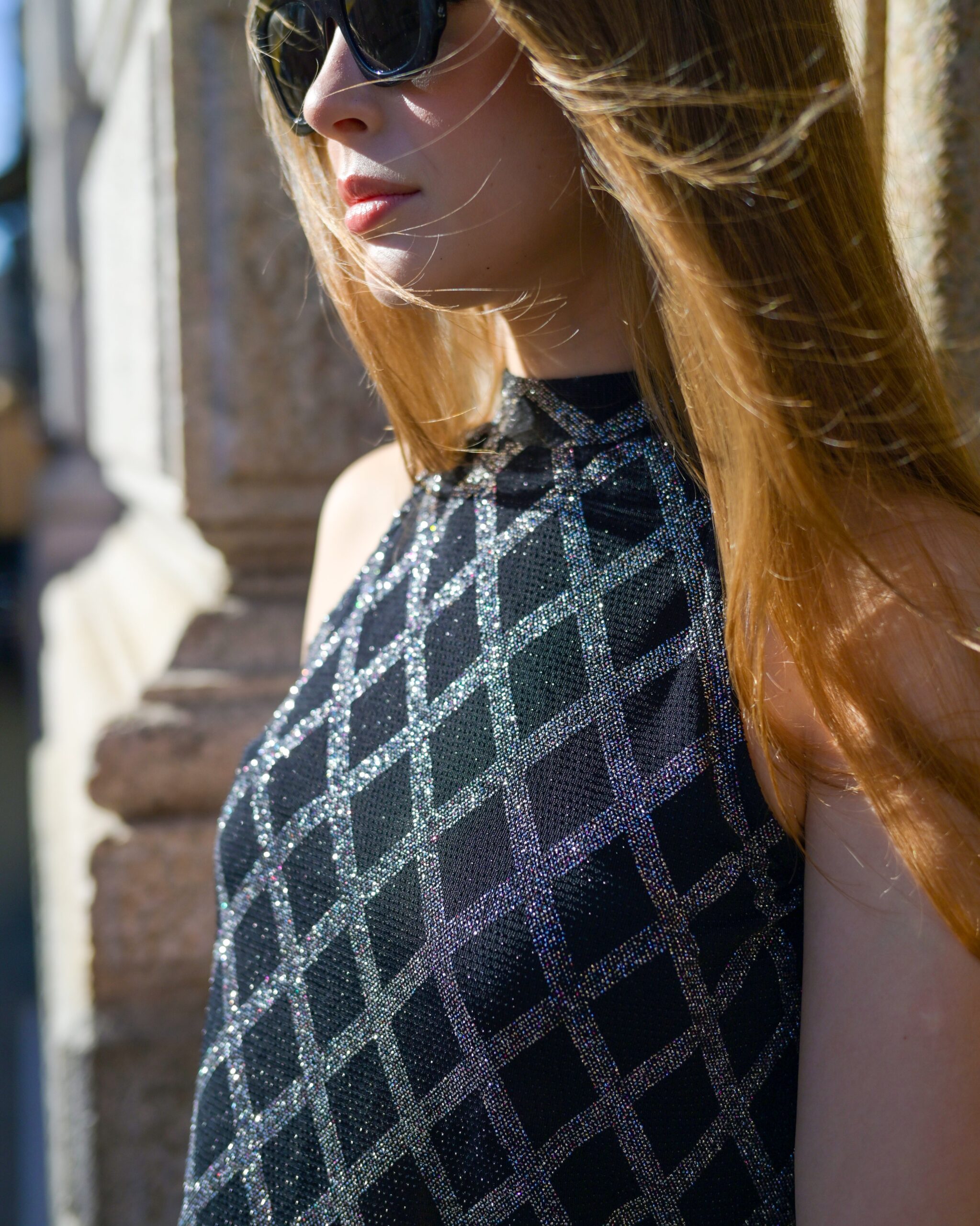 Top halter confeccionado en tejido fantasía negro con brillos plateados. Ideal para la noche o eventos especiales.