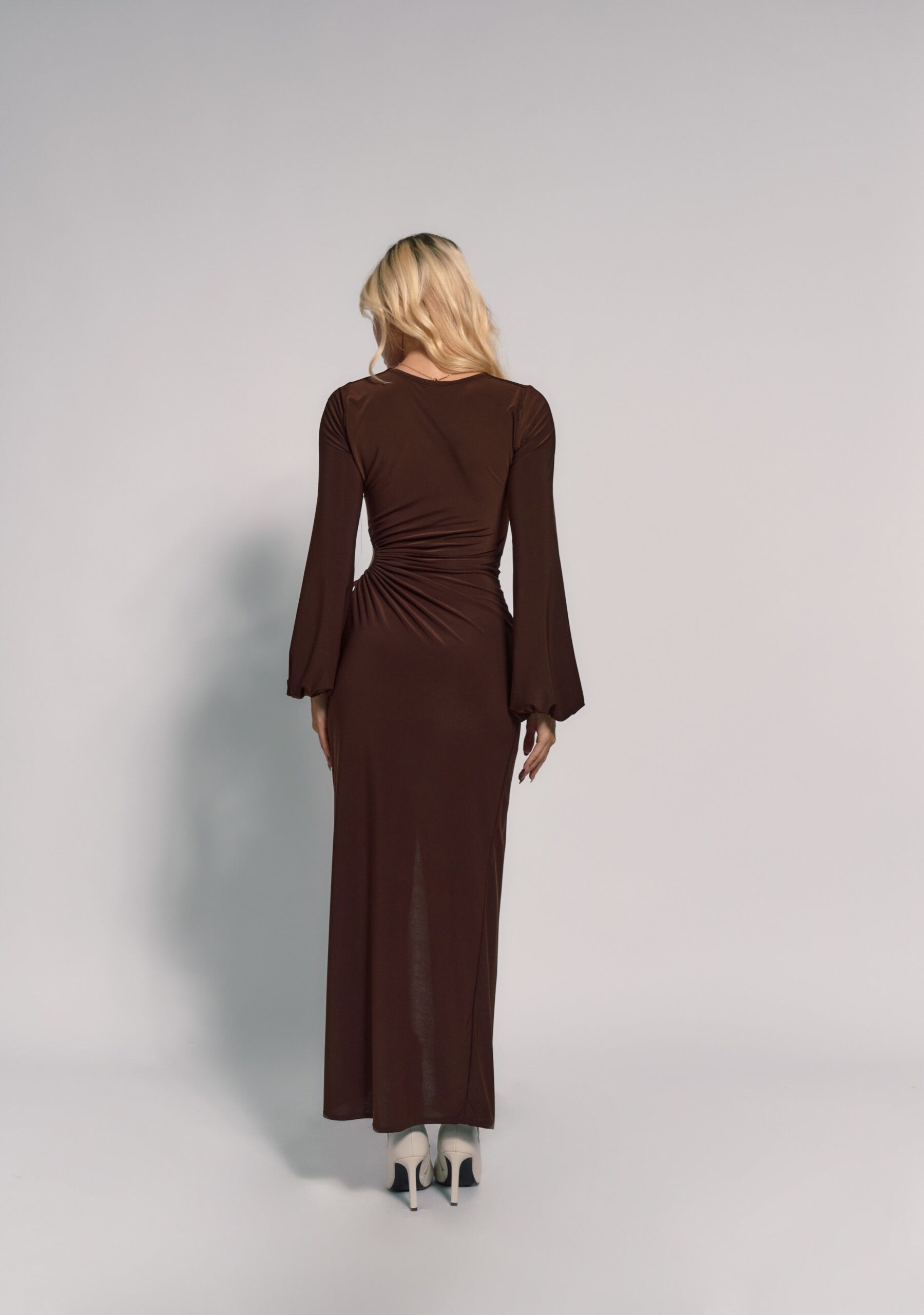Vestido largo con un diseño ajustado y detalles que lo hacen elegante y moderno. Tiene un corte asimétrico en la parte inferior, con una abertura lateral que expone la pierna de manera llamativa. En la zona de la cintura, cuenta con un detalle de fruncido que crea un efecto visual interesante, además de un recorte en uno de los costados que añade un toque atrevido. Las mangas son largas y ligeramente abullonadas, con puños ajustados. El cuello es de escote cuadrado.