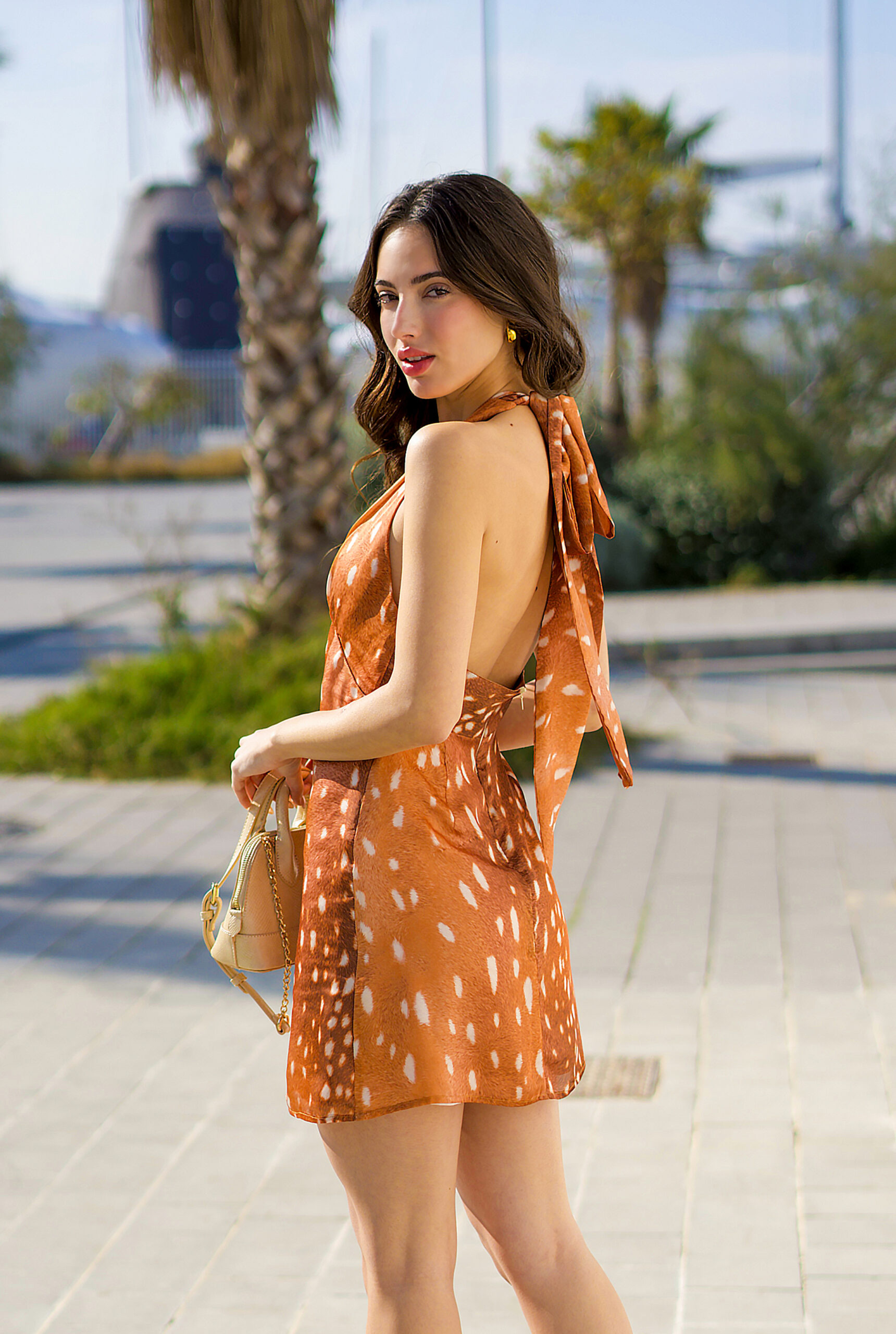 Confeccionado en tela efecto satinado con Animal Print Bambi, su escote profundo y drapeado favorece la silueta sin esfuerzo. se anuda detrás del cuello en forma de lazo, aportando un toque delicado que acompaña cada movimiento.